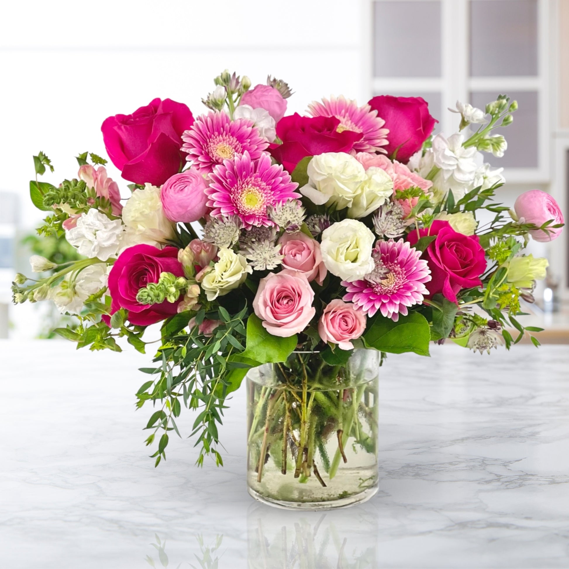Lush with hot pink roses, playful gerbera daisies, ranunculus, lisianthus, and textural summer stems, this cheerful arrangement brings major feel-good energy. Designed in a clear glass cylinder and full of citrusy hues and seasonal charm, Slice of Summer is the perfect pick for birthdays, celebrations, or just because.