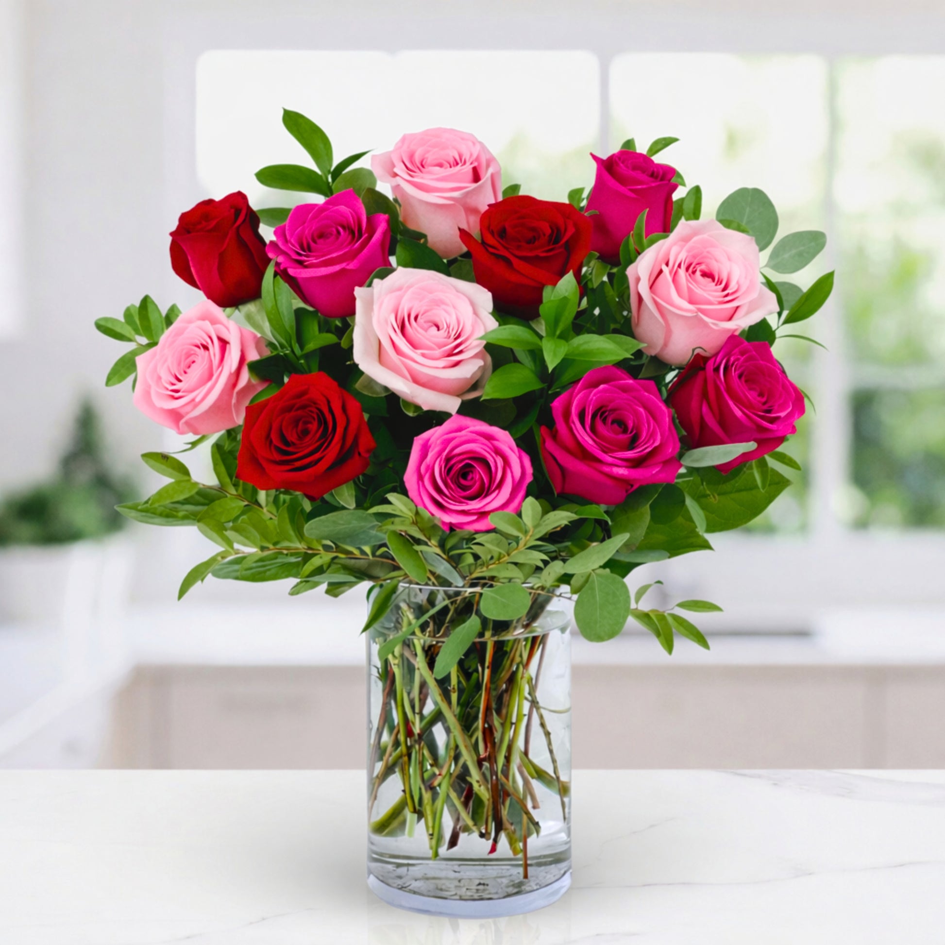 A dozen assorted roses—thoughtfully arranged with fresh greenery in a clear glass cylinder vase—create a look that feels forever in style. Ideal for anniversaries, celebrations, or passionate expressions, this classic arrangement speaks with quiet confidence.
