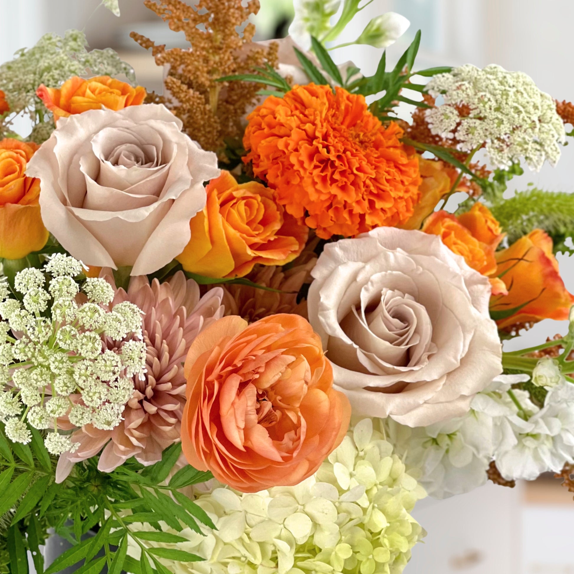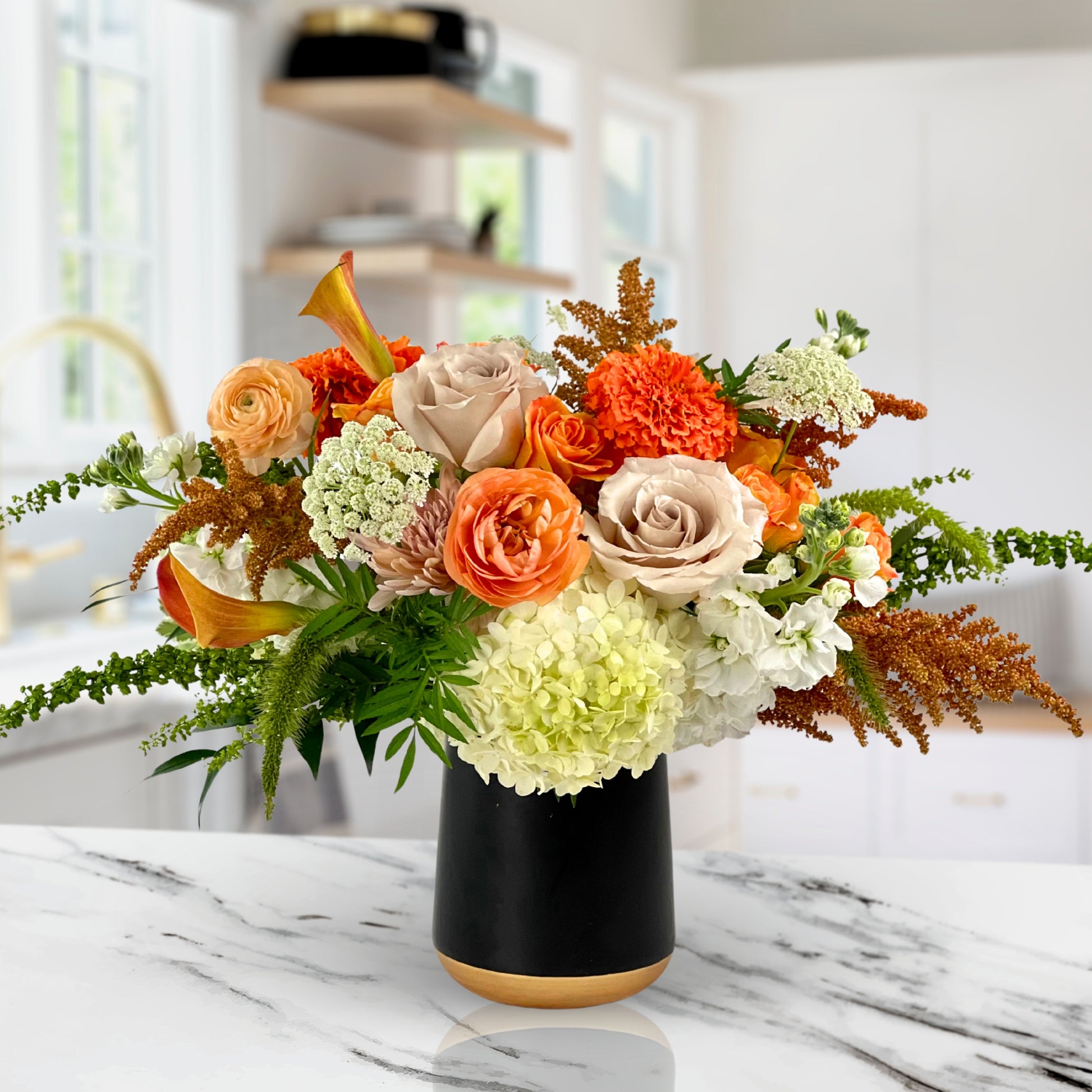 Bold orange marigolds and ranunculus meet soft taupe roses, creamy hydrangea, and accents of golden amaranthus and Queen Anne’s Lace, all styled in a modern matte black vase. Striking, whimsical, and full of Autumn energy, this Halloween-inspired floral design is perfect for sending festive wishes, seasonal birthdays, or a little everyday magic. Available for same-day flower delivery across Northern Virginia.