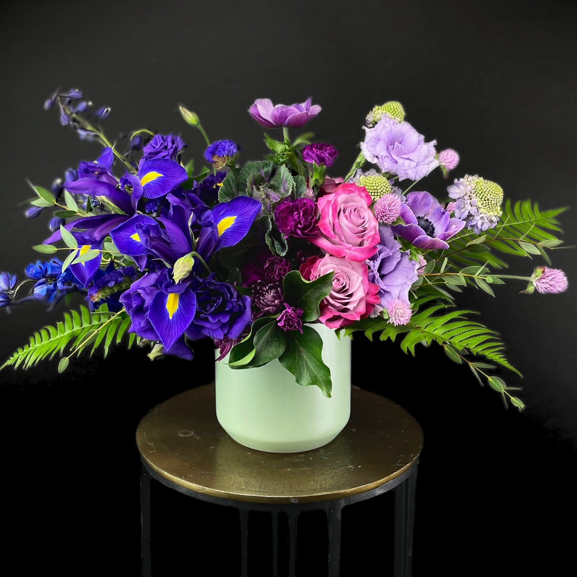Our Dancing in the Moonlight arrangement is a stunning creation that exudes elegance and charm. It incorporates a harmonious blend of blues and purples, making it a perfect representation of nature's beauty. What sets this arrangement apart is its ombré color palette, which gracefully transitions from darker tones to lighter shades. This intricate color scheme enhances the artistic appeal of the arrangement, capturing the essence of a mesmerizing moonlit dance.
