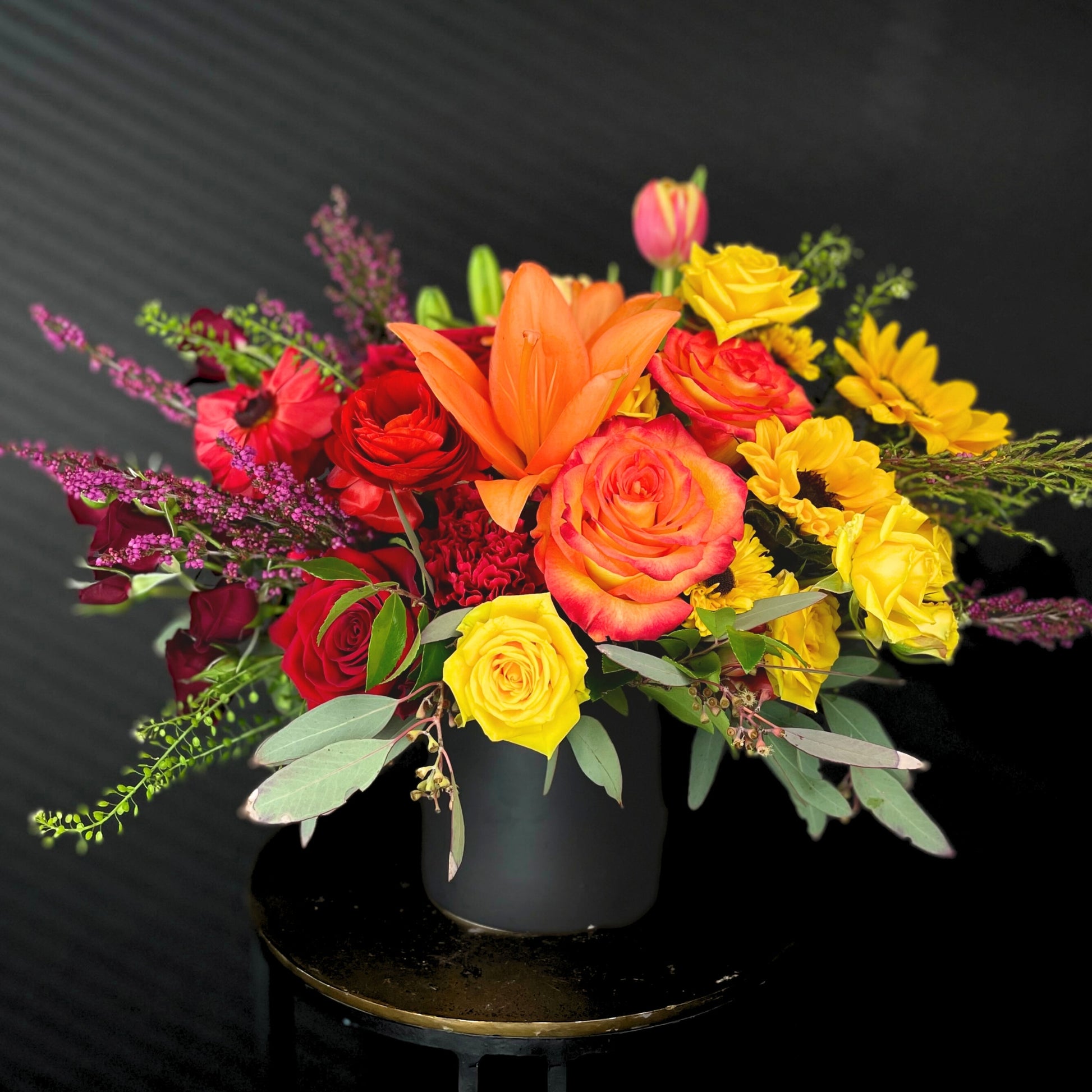 Our Burning Love arrangement is a fiery testament to passionate feelings of love and devotion. Each bloom is artistically arranged in a black ceramic container, which adds a touch of sophistication and elegance to the overall look. The red flowers symbolize love and desire, while the vibrant orange represents energy and enthusiasm. The yellow flowers bring warmth and happiness into the arrangement, completing the fiery color palette. Burning Love is perfect for occasions where you want to express your intense emotions, whether it's passionate love, a fiery celebration, or a bold declaration of affection. This eye-catching arrangement is sure to captivate.