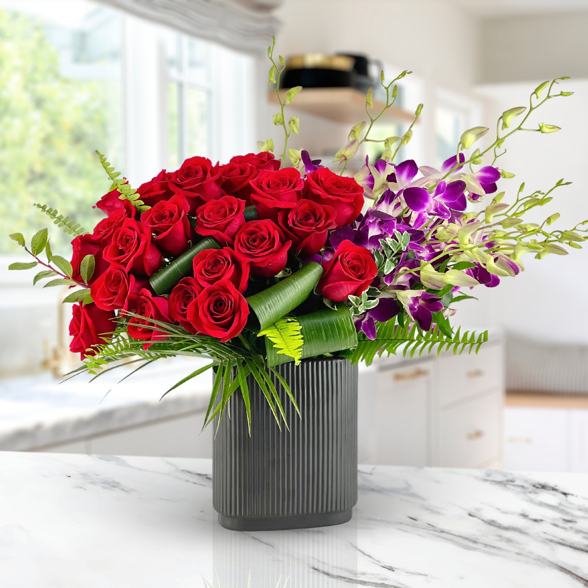 This bold, modern arrangement is designed to impress. Featuring two dozen rich red roses combined with exotic purple dendrobium orchids, this sculptural composition is styled with tropical foliage and premium greenery in a sleek, matte black ceramic keepsake vase.
