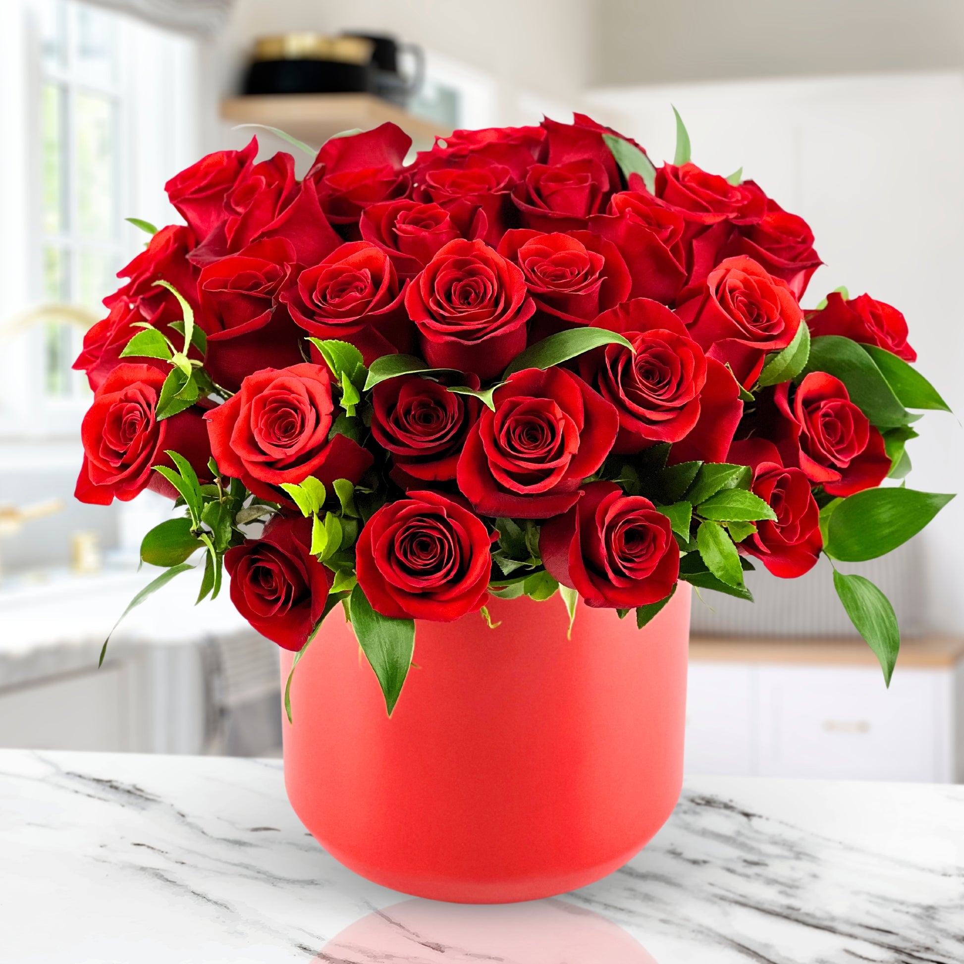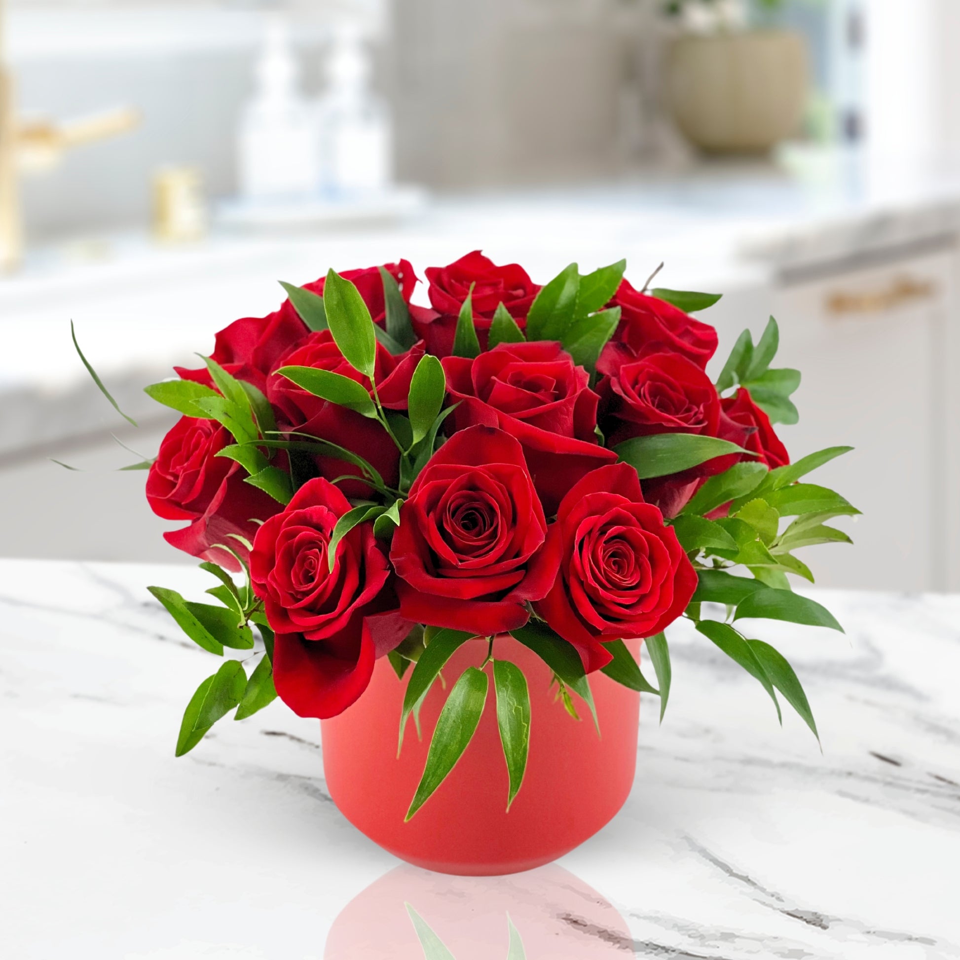 Classic, bold, and unforgettable — Ruby Romance is a striking arrangement of premium red roses, designed with intention and elegance. Nestled in a modern red ceramic vase and accented with sculptural tropical greenery, this design keeps the focus on what matters: the roses, in all their timeless beauty.