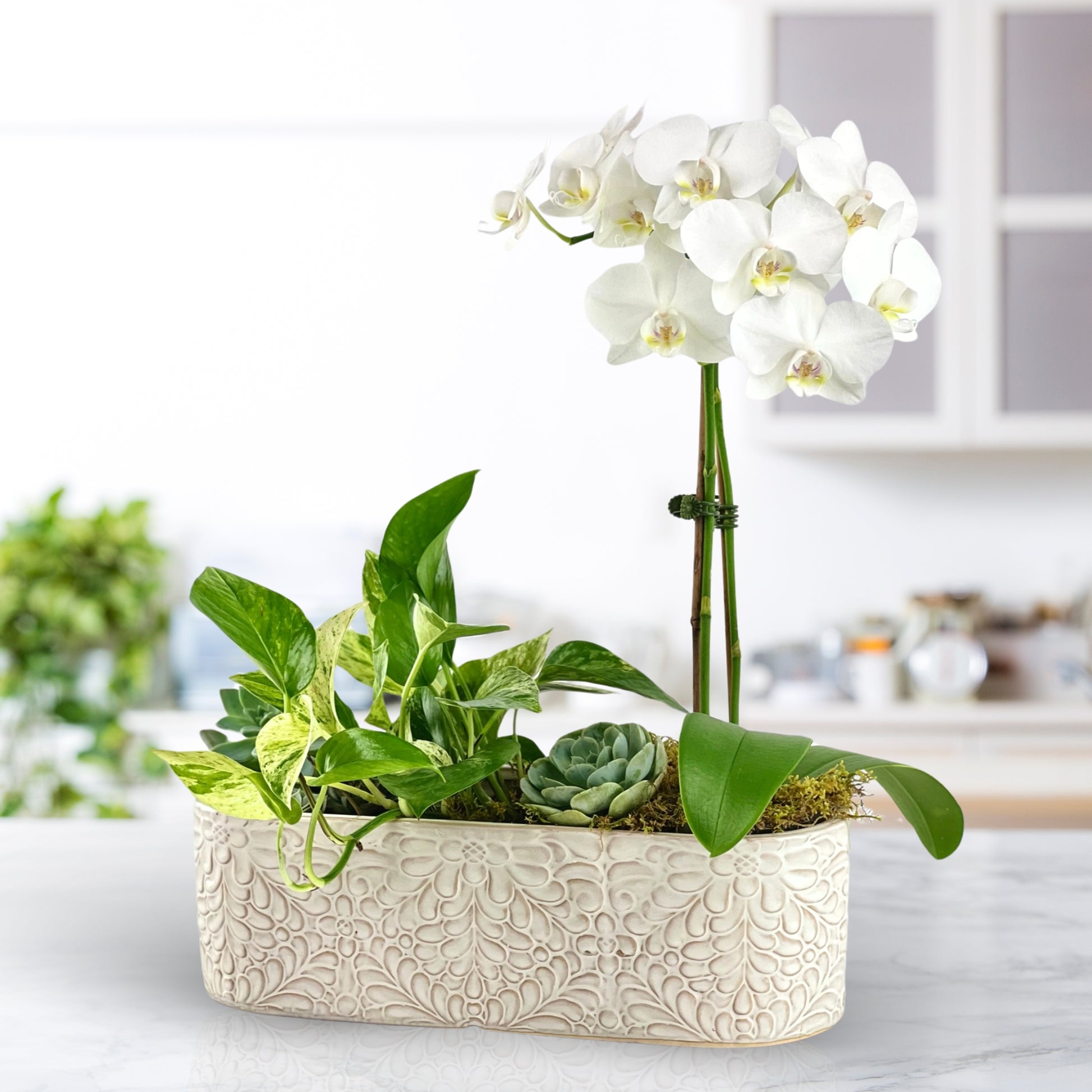 A living work of art, Botanical Enchantment brings together sculptural textures and lush greenery in one curated ceramic dish garden. This sophisticated piece features a blooming white phalaenopsis orchid paired with an elegant mix of easy-care houseplants — including trailing pothos, and sun-loving succulents — all nestled in a detailed ceramic keepsake container.