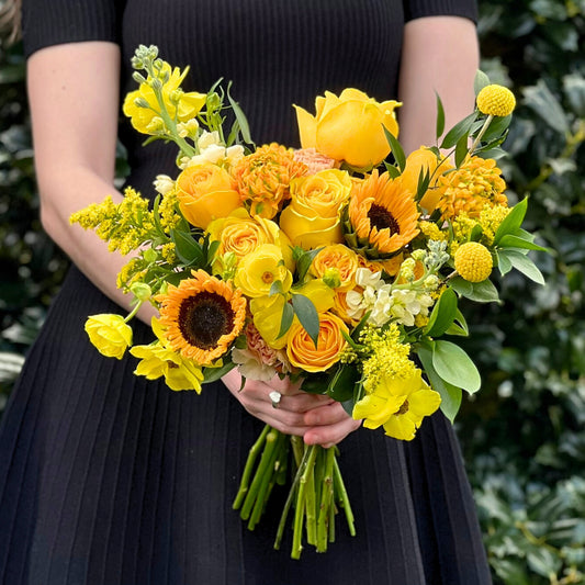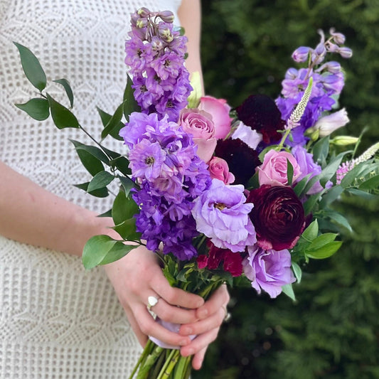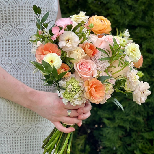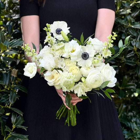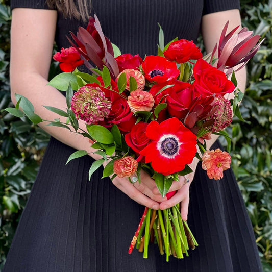 Our handheld prom bouquets — a modern twist on the traditional corsage — are available in a variety of tones, textures, and bloom styles. While specific flower varieties may vary based on seasonality and availability, we will always design your florals to match the look and feel of the style pictured online. This includes maintaining the same color palette, shape, and design aesthetic unless otherwise requested.