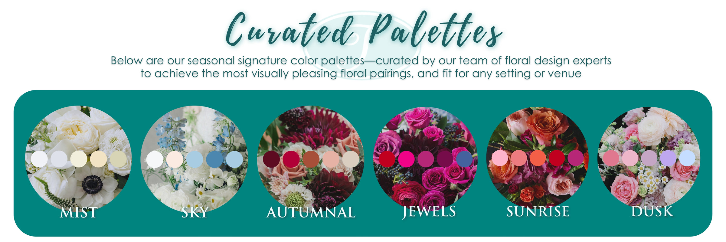 Your wedding day color story is arguably the most important (and most fun!) part of the process! Select one of our signature palette options curated by our expert design team, or opt for a *custom palette that ties in your dress, venue setting, and overall aesthetic.