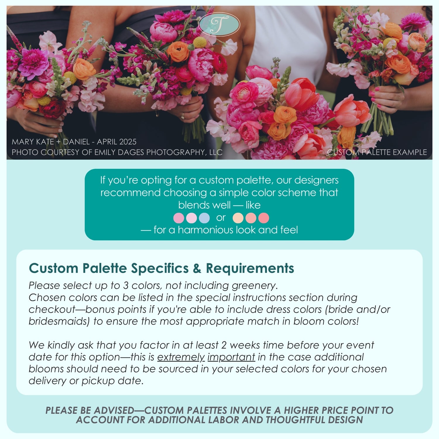 *Because customization requires a bit more labor (and love) behind the scenes—from sourcing blooms in specific tones on an expedited timeline, to extra thoughtful design planning—our custom palette pricing is inflated to reflect the additional magic required to create your bouquets.