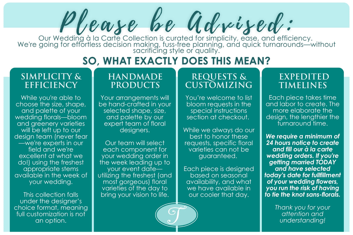 Ideally, we recommend planning and ordering your flowers 5+ months out, but we understand everyone's timelines are different! Our à la carte collection was designed for anyone and everyone—whether your wedding day is a year away, or right around the corner. The only conditions you'll find here at Twinbrook Weddings à la Carte are: