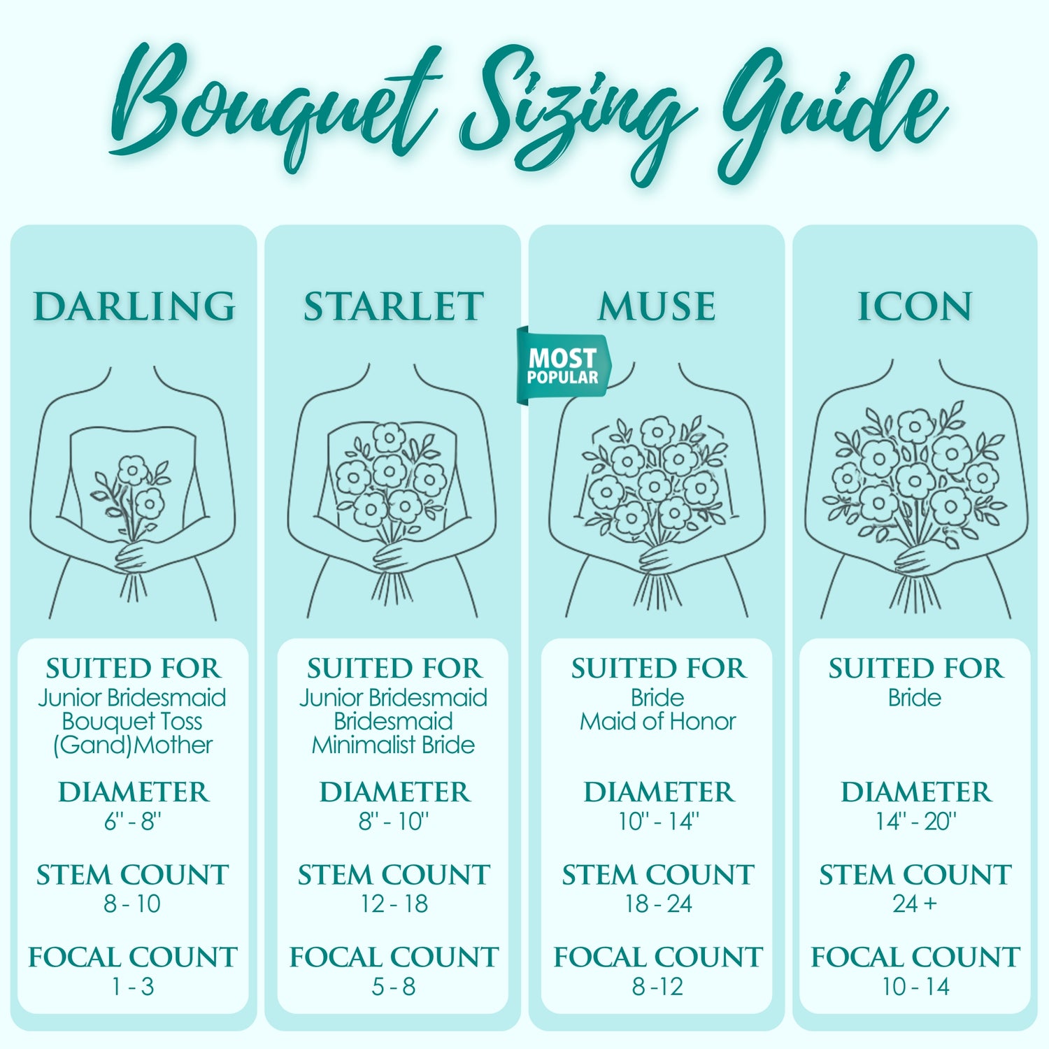 Our visual sizing guide breaks down our signature sizing—from petite and darling to bold and iconic—so you can confidently choose the bouquet that fits your bridal vision best.
