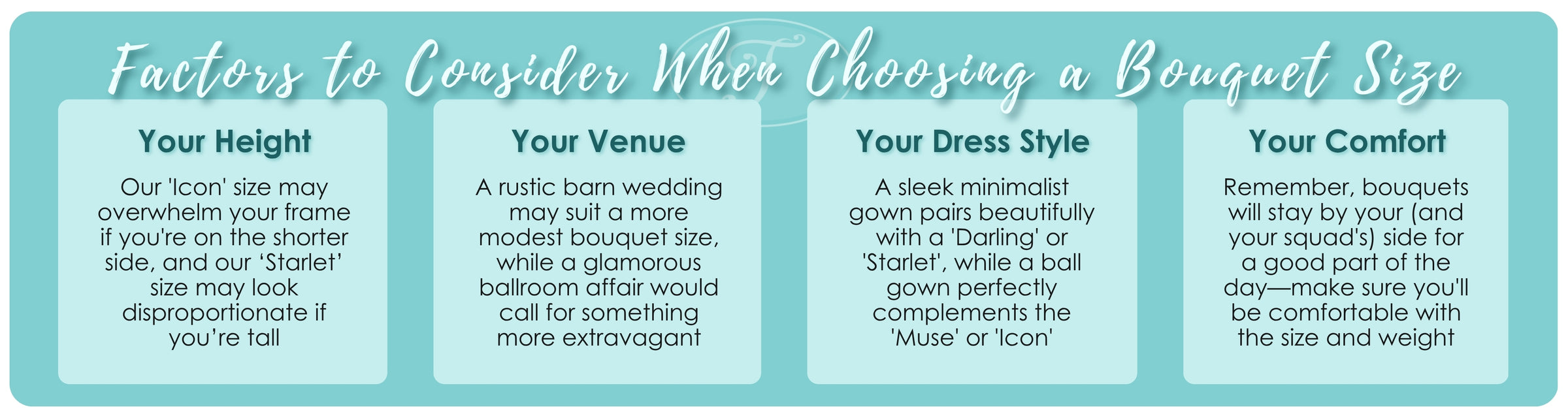 The perfect bridal bouquet can take your look from beautiful to breathtaking, and we're here to help you find the style that fits your day just right. One that complements your dress, your vibe, and your big entrance. Below you'll find a list of factors to take into consideration when choosing your bouquet size.