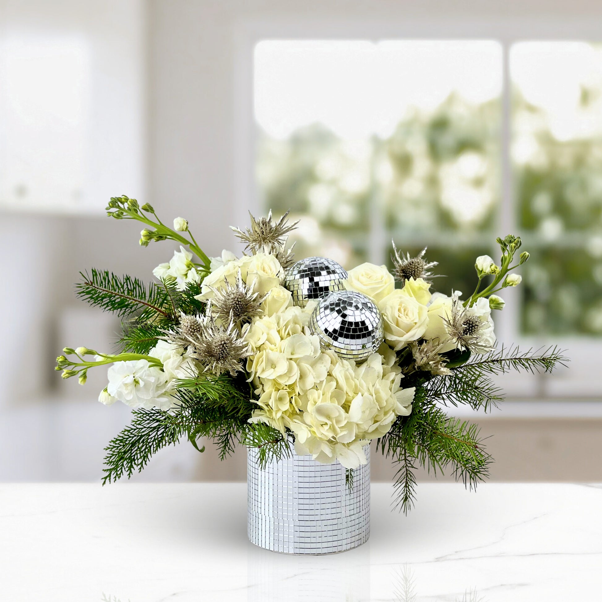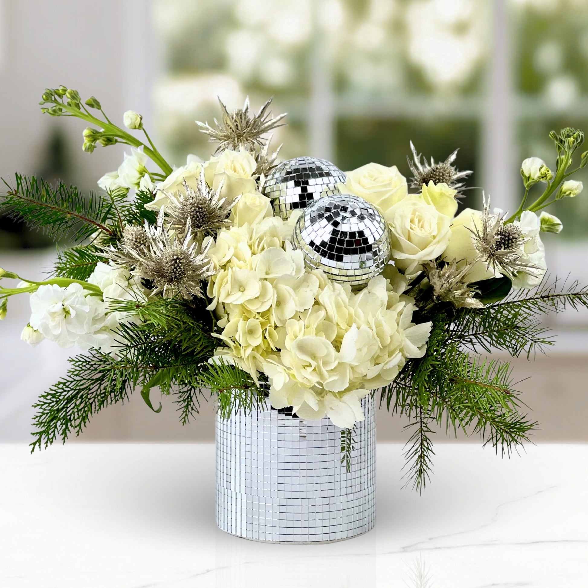 Celebrate the season in high style with Disco Kisses & Winter Wishes, a modern floral arrangement bursting with wintry cheer and a touch of retro glam. Crisp white roses and fluffy hydrangea are accented with metallic thistle and evergreens, while mirrored disco balls steal the show—making this design a perfect choice for New Year’s parties, winter birthdays, or anyone who loves a little sparkle.