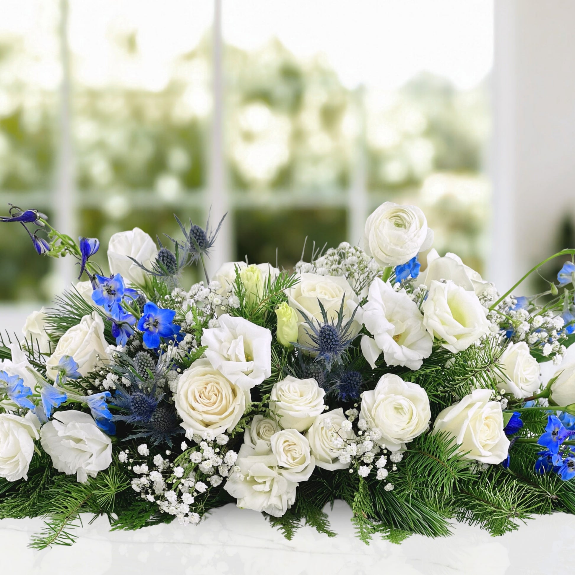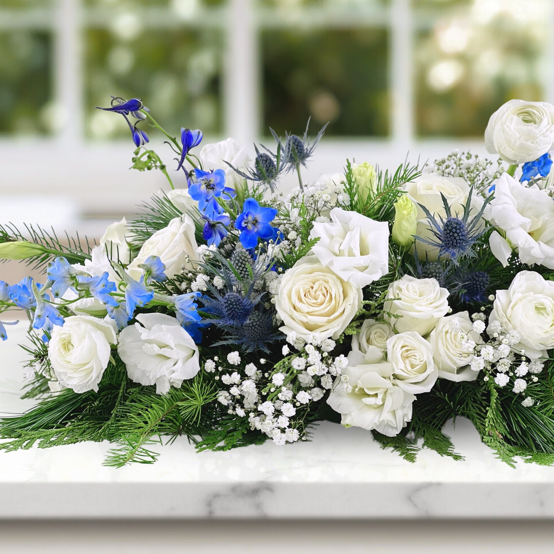 Our Glimmering Light Centerpiece captures the calm, icy beauty of winter with a graceful palette of whites, blues, and fresh (and fragrant) seasonal greenery. Featuring crisp white roses, bright lisianthus, delicate ranunculus, and accents of sapphire-blue delphinium and thistle, this table arrangement feels both festive and refined. Layered with textures and designed as a long and low, it’s perfect for dining tables, credenzas, or to accent a kitchen counter for the family gathering.