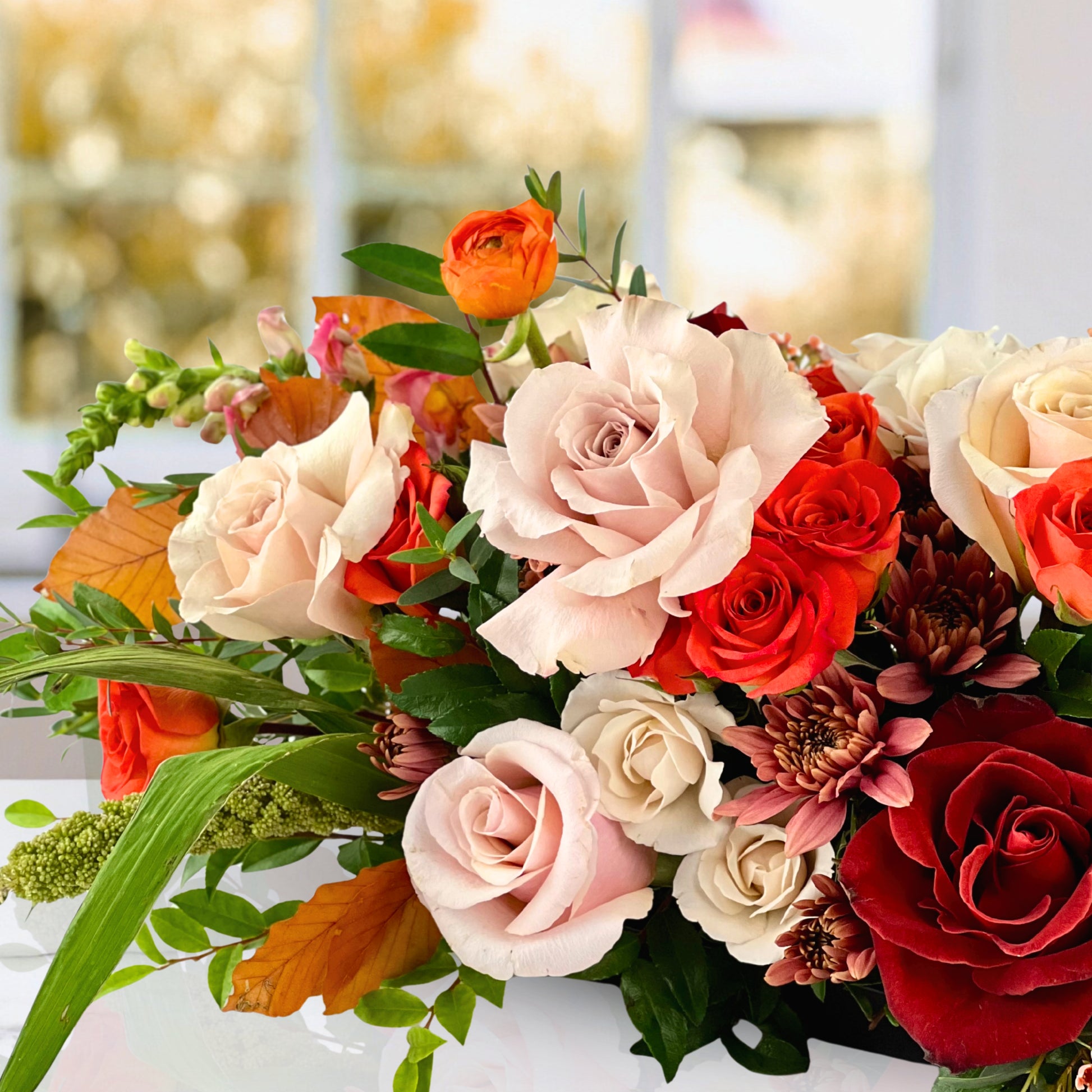 Featuring a blend of blush, burgundy, ivory, and persimmon tones, this whimsical centerpiece combines luxe garden roses, festive fall mums, bouncy ranunculus, and lots of playful autumn textures in long & low centerpiece style. Whether you’re hosting Thanksgiving dinner or sending a seasonal surprise, Gratitude in Bloom captures the essence of togetherness and grace and makes for a lovely addition to any gathering.