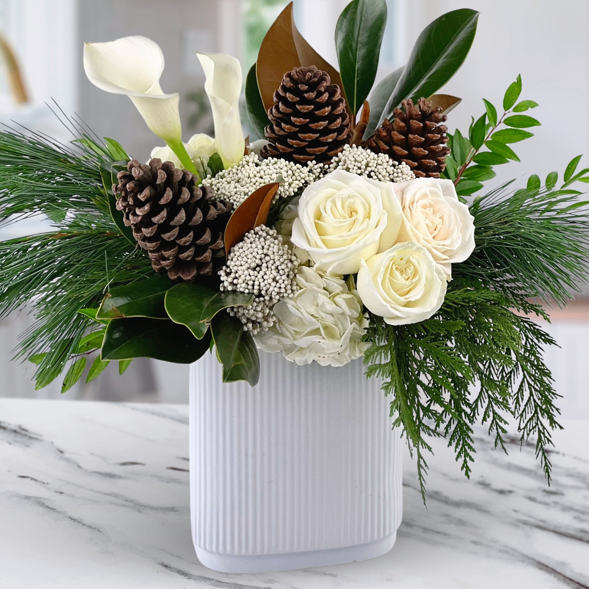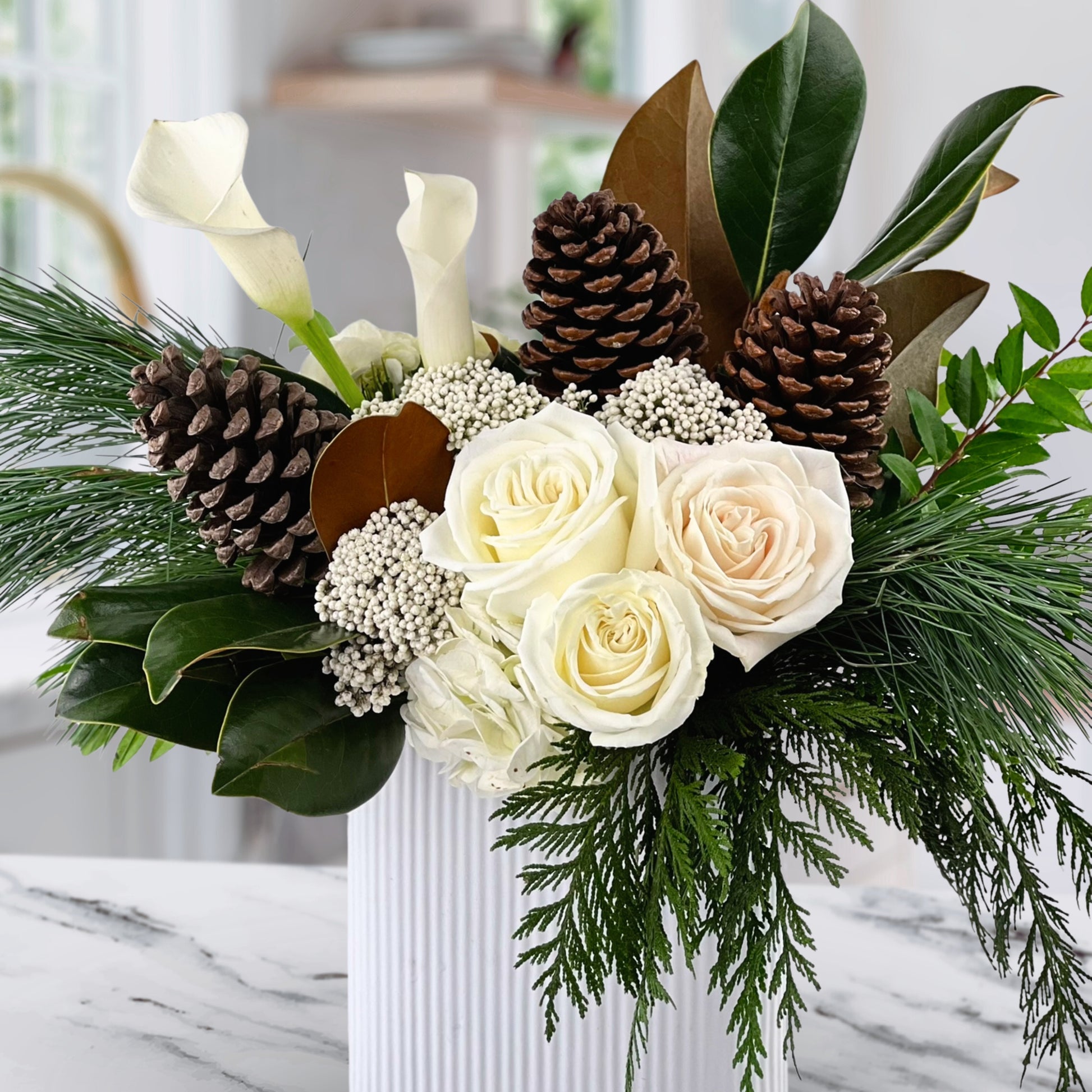 Let your holiday season shine in refined beauty with Modern Noel—a chic winter arrangement designed for those who love a minimalist moment with major impact. Featuring crisp white calla lilies and roses, textural rice flower, luxe magnolia leaves, fragrant evergreens, and natural pinecones—all arranged in a modern white ceramic envelope vase. It's a serene statement piece for winter dinner parties, holiday gifting, or simply elevating your home with seasonal sophistication.