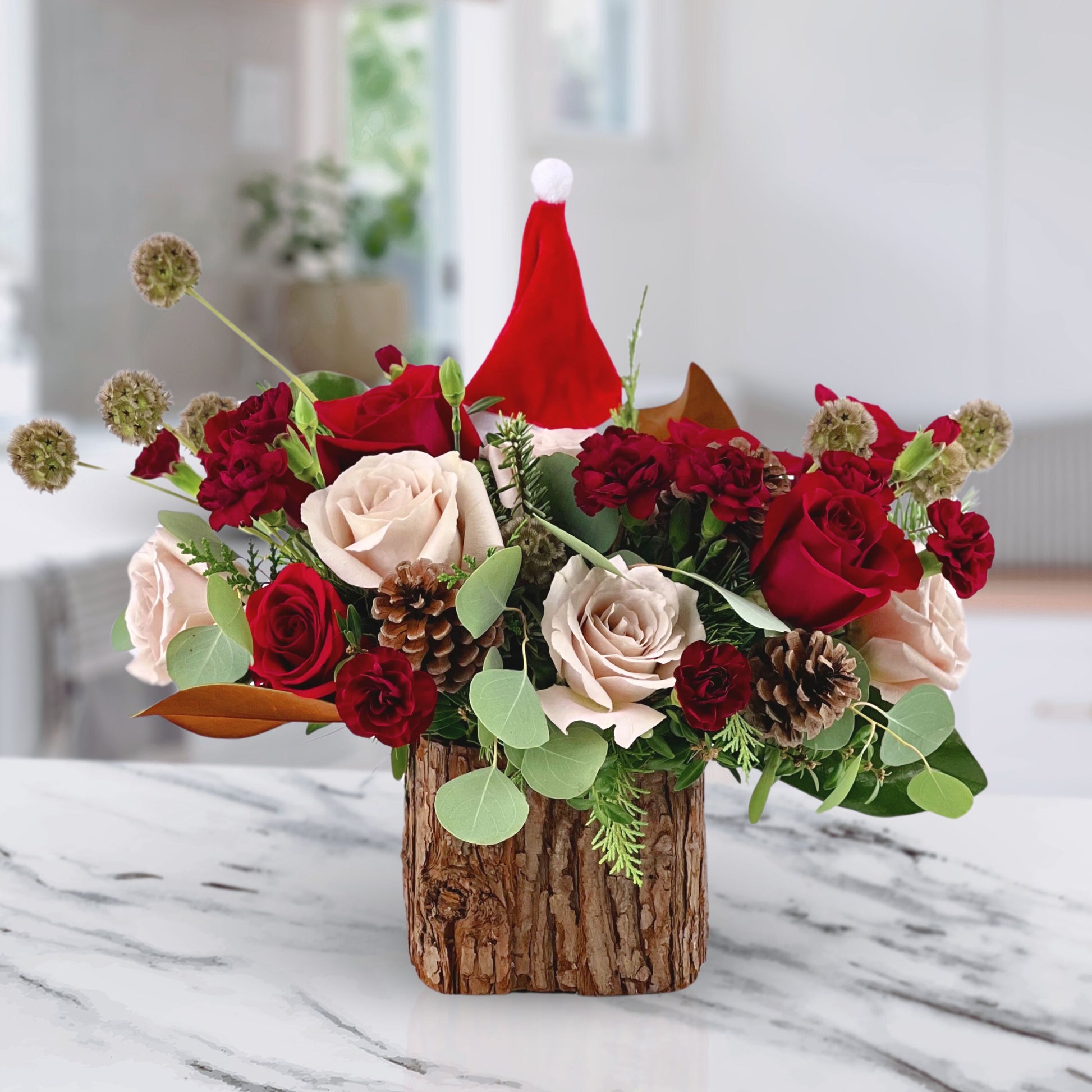 Decked with charm and a cheeky little Santa hat, Naughty or Nice blends classic Christmas spirit with rustic elegance. Nestled in a natural bark-covered glass vase, this design features a luxe medley of velvety red roses, soft beige garden roses, fragrant winter greenery, pinecones, and playful texture—finished with a pop of seasonal whimsy tucked right into the blooms.