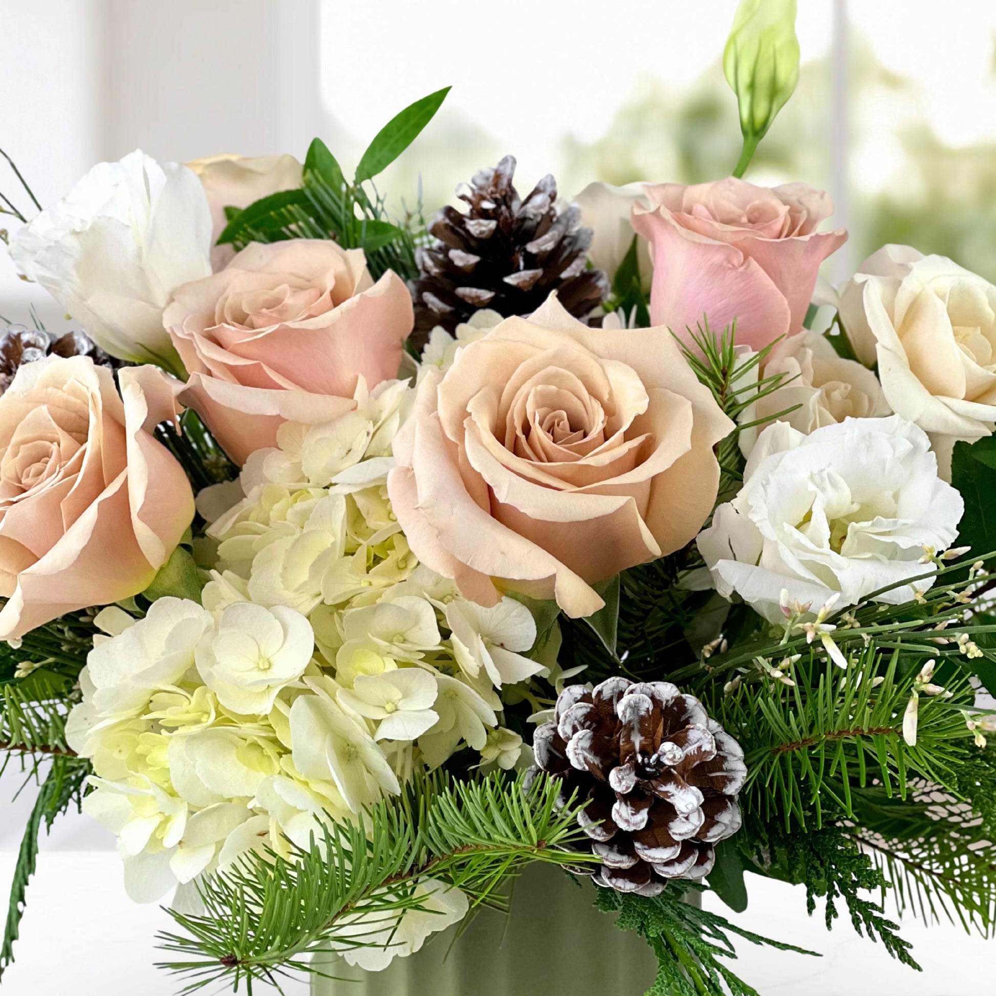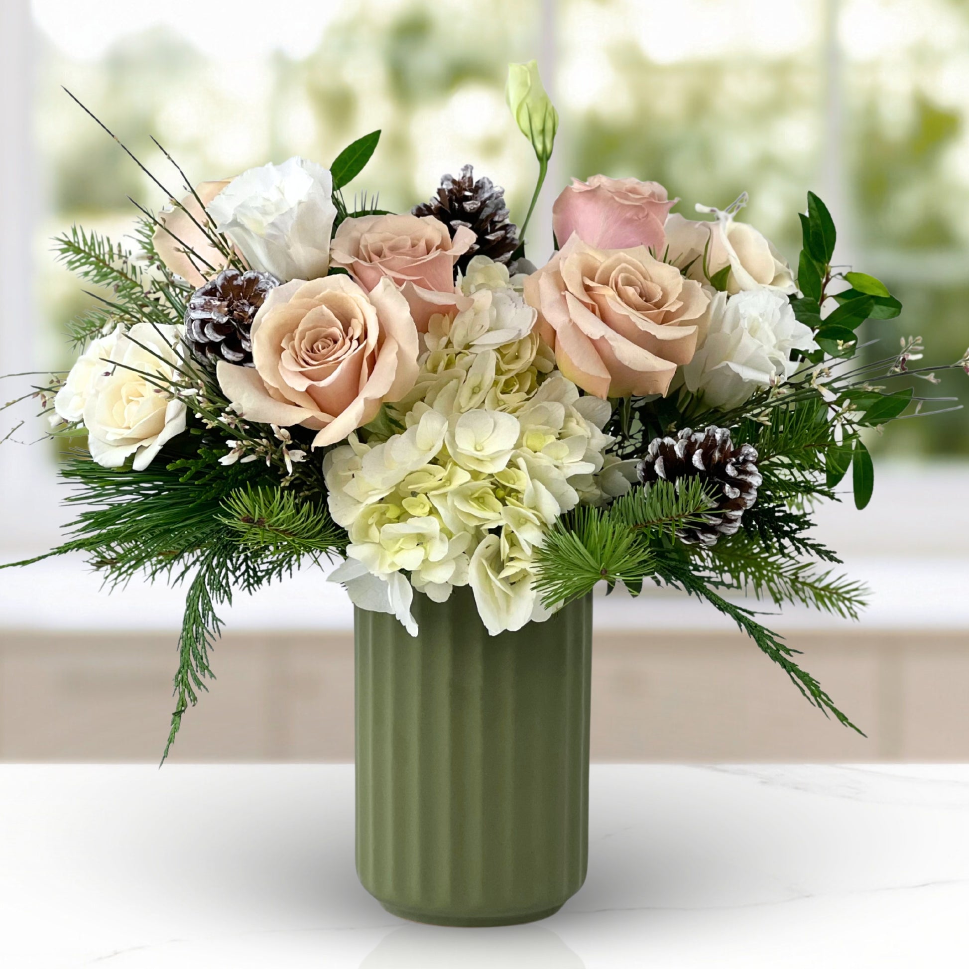 Breathe in the season with Scents of the Solstice—a serene and stylish winter arrangement crafted to bring warmth, elegance, and just the right amount of pinecone spice into any space. With soft beige roses, fluffy ivory hydrangea, crisp white lisianthus, and glistening frosted pinecones nestled in fresh, fragrant evergreens, this piece is perfect for gifting or gracing your holiday table.