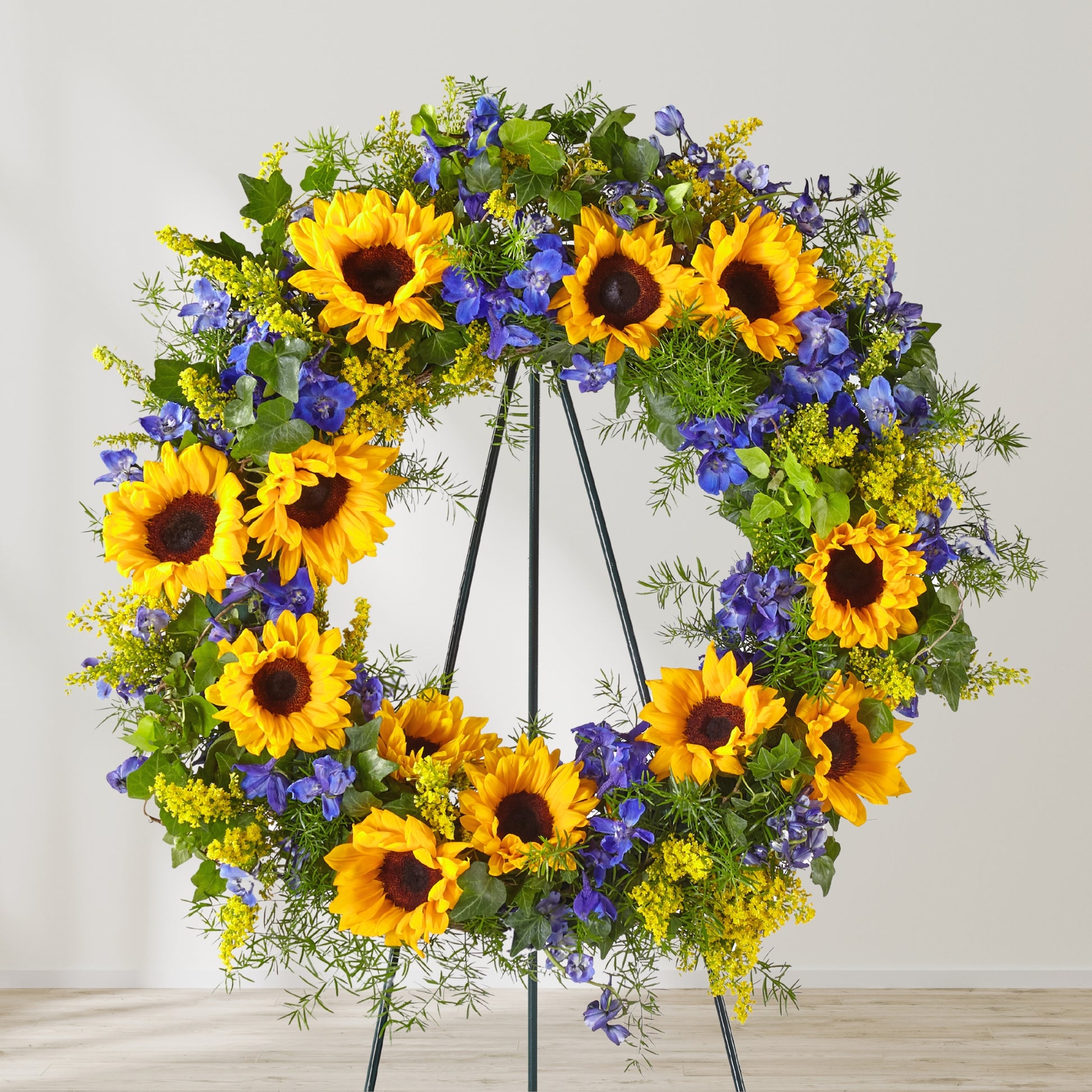 The beautiful sunflowers in our Summer's Gone wreath offer a display of admiration, loyalty and hope. Each bright bloom is complemented by lush greens and blue delphinium blooms. Their uplifting nature reminds loved ones of your support and the brighter days ahead as they navigate through a difficult time.