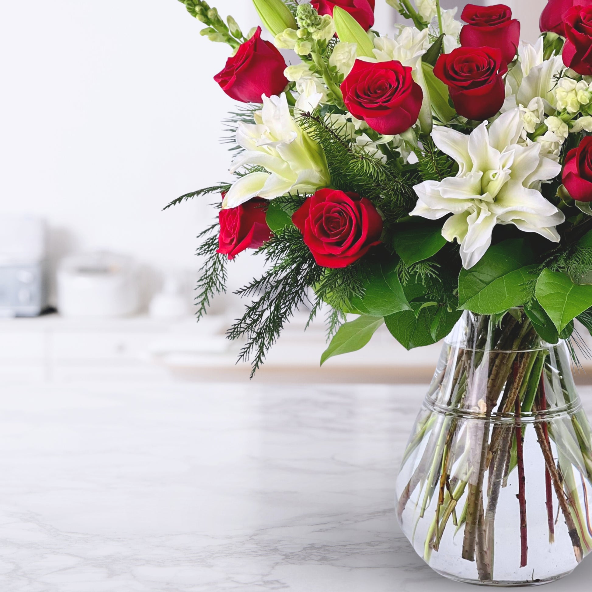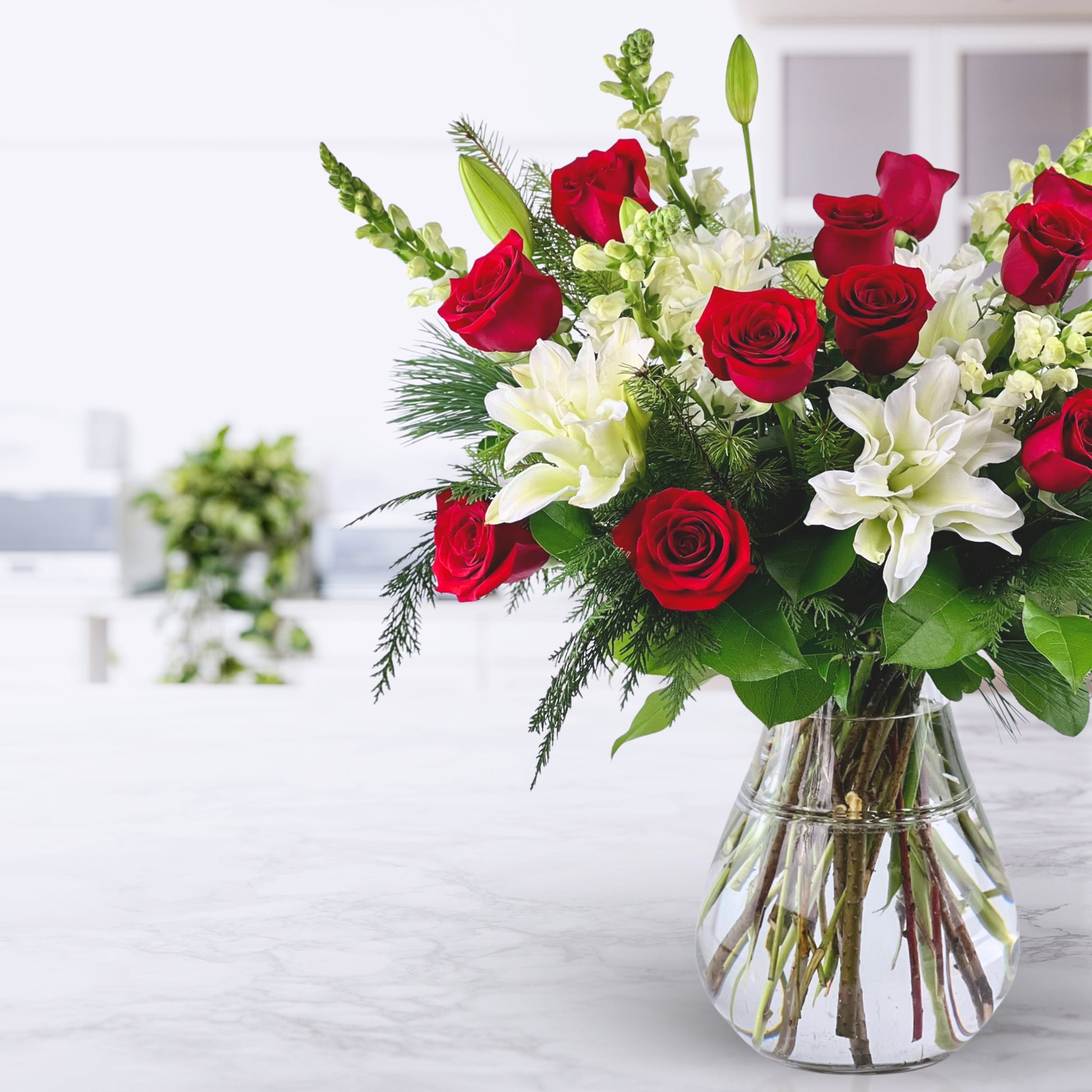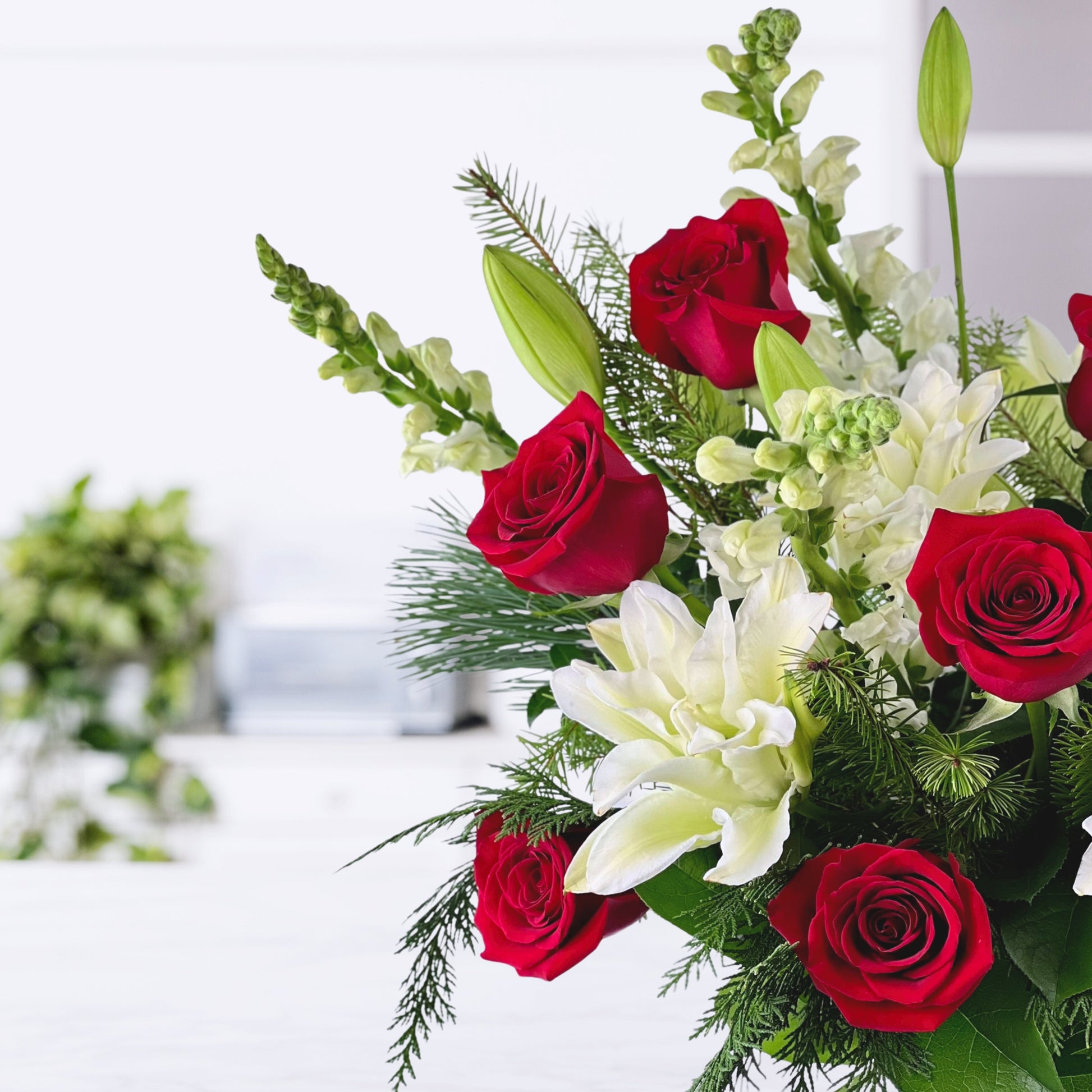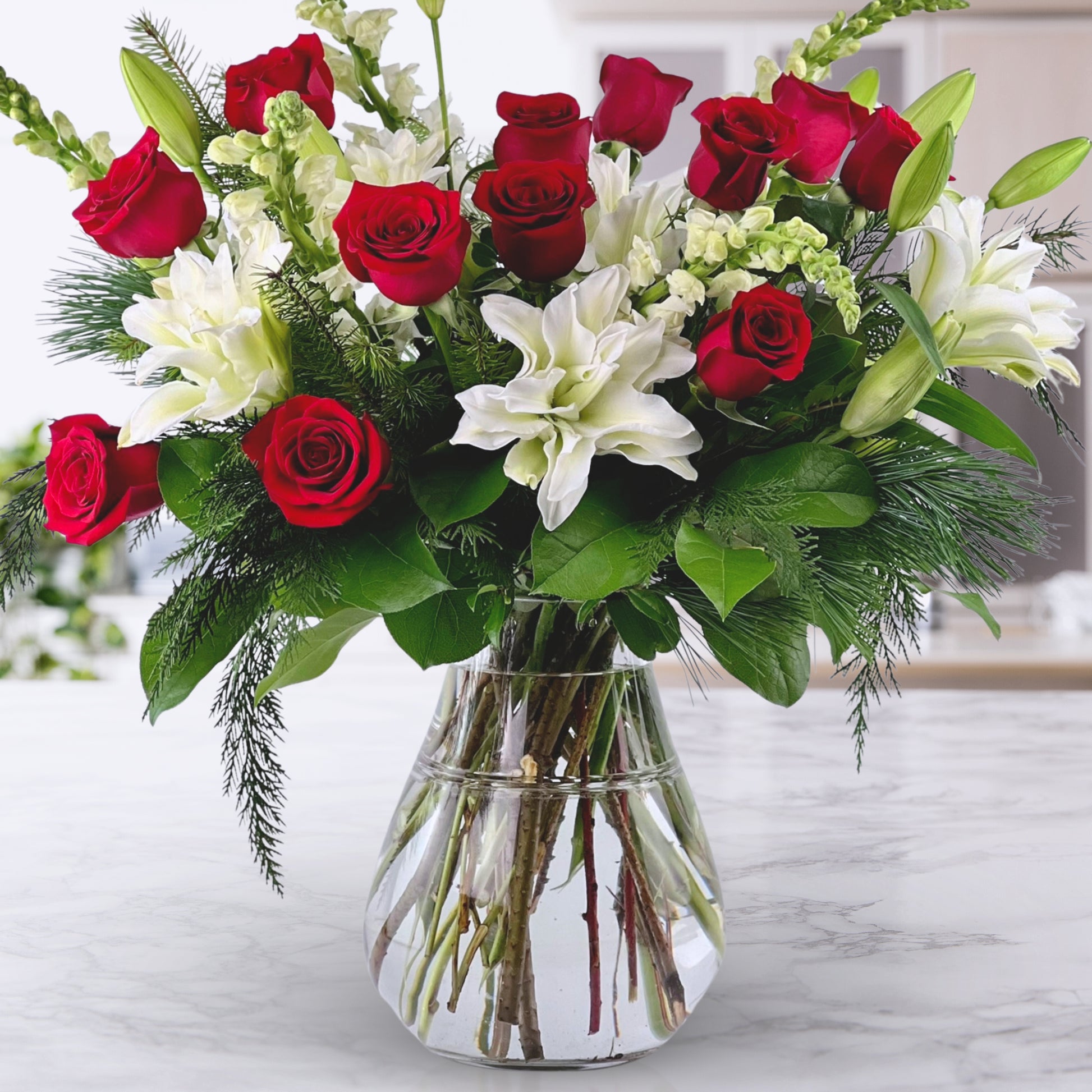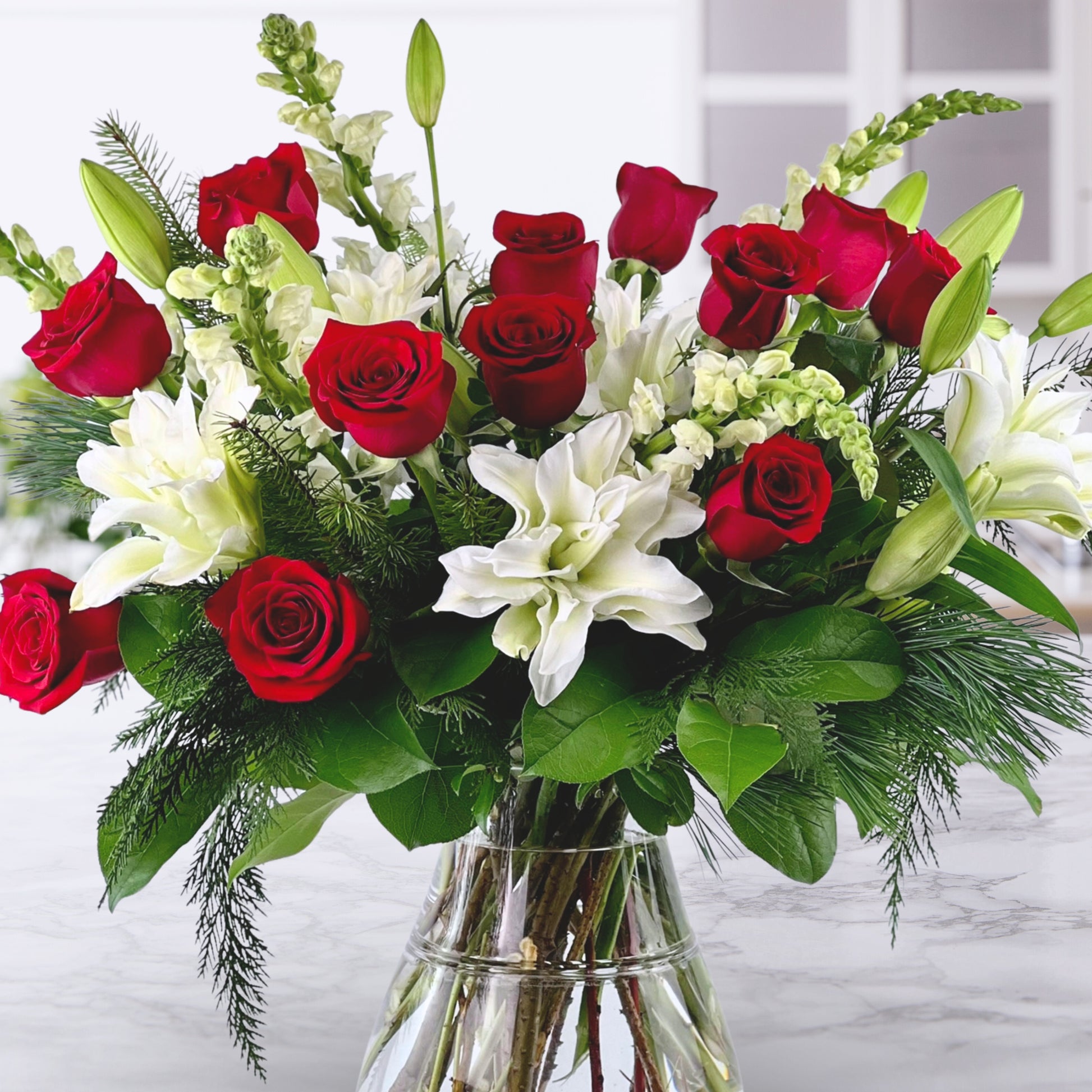A luxe mix of velvety red roses and lush white lilies makes this arrangement a true standout. Layered with textural winter greens like noble fir, cedar, and pine for depth and fragrance, Frosted Winter Elegance is the type of floral statement that begs to accent grand holiday tables, elegant foyers, or sent as a luxurious seasonal gift.