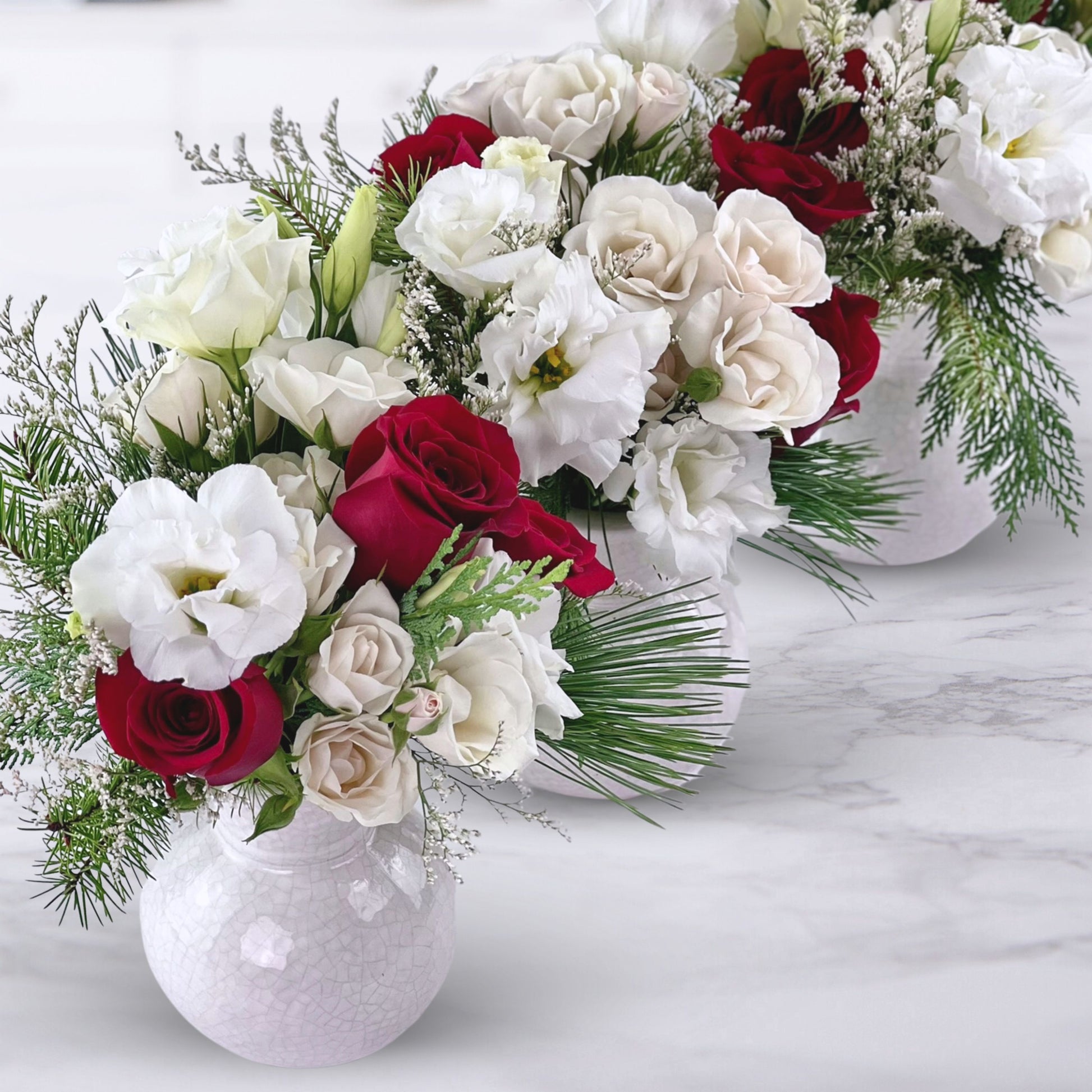 Brighten your holiday table or gift list with a festive set of winter bud vases—featuring velvety red roses, creamy spray roses, bright white lisianthus, and fragrant seasonal greenery—all gathered in pearlescent ceramic bud vases. Each piece it's own petite gathering of winter magic.